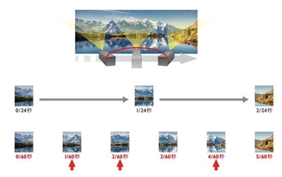 預覽和重播功能是NVR核心功能;但低幀率影片播放畫面卡頓,高幀率又存在佔用存儲空間過大;源頭高壓縮編碼影片,會導致畫質效果不好;利用MEMC技術,有信心錄製更小的碼率影片,從而達到減少存儲空間目的,如下圖所示,由24幀補至60幀,使畫面更流暢